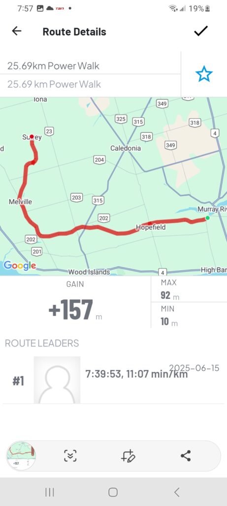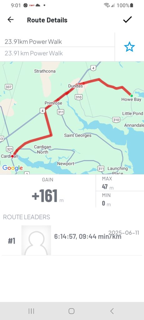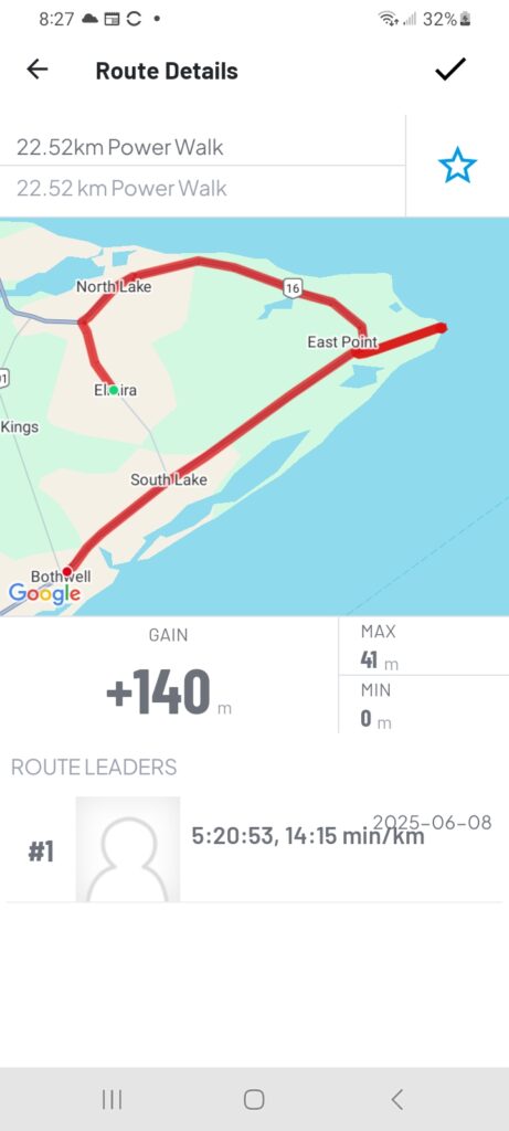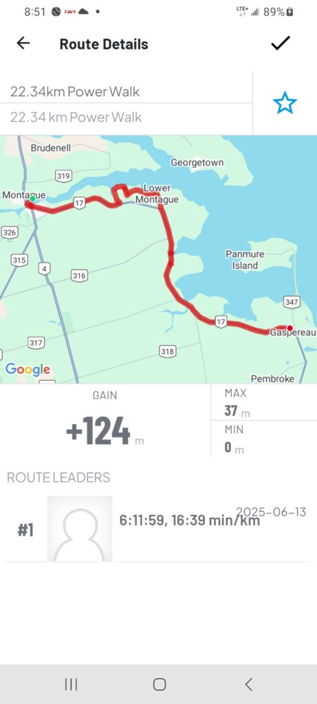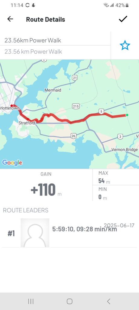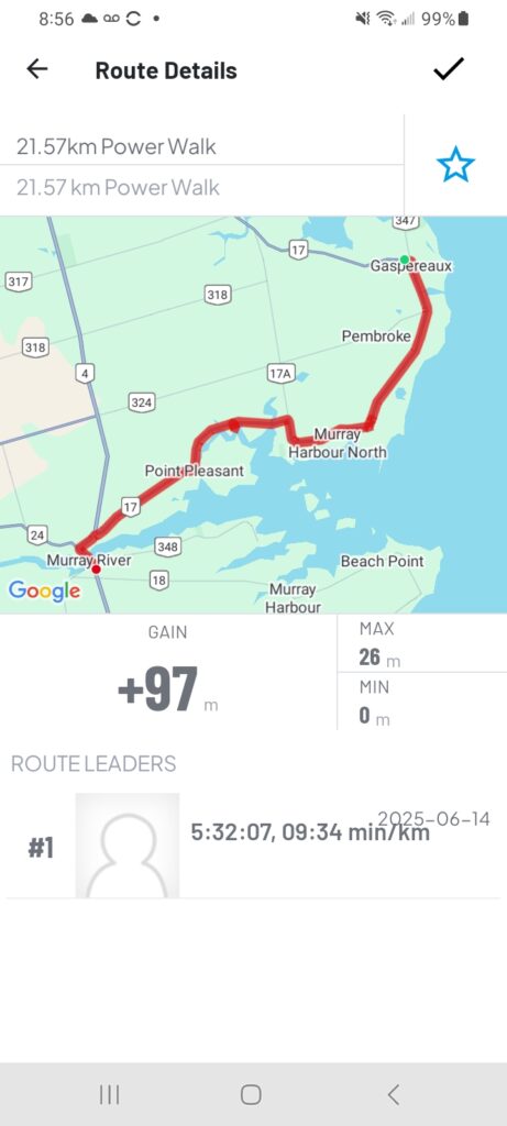 Now about today, the weather could not have been more perfect, a bit over cast and a little breezy. We used the newest Island Walk route into Charlottetown and it worked out really well. For those that are doing the walk I recommend not trying to follow the printed directions just follow the Island Walk signs they were very clear.